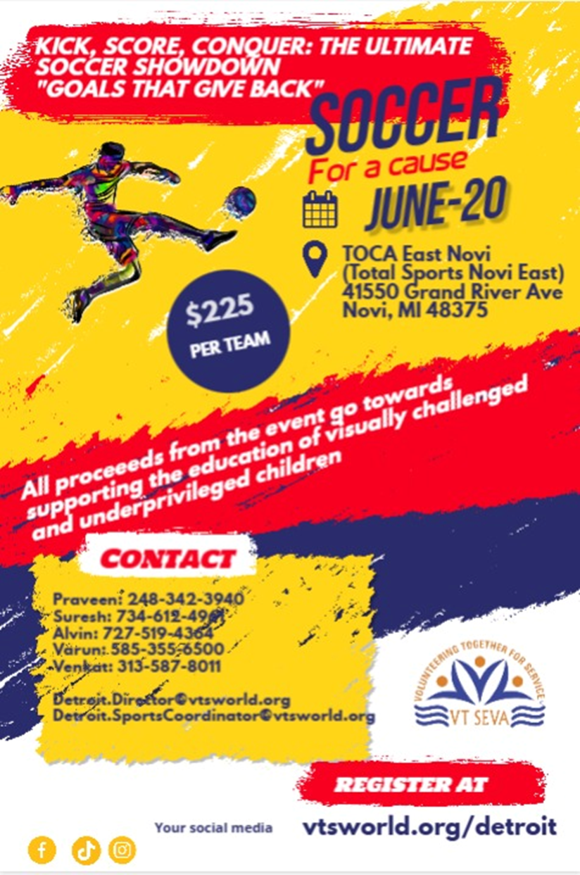 VT Seva Detroit is conducting its 7th Annual Soccer Tournament this summer. All the proceeds go to VT Seva supported Schools for the Blind